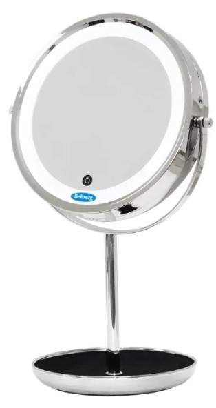 pengilang Jerman. Cermin bulat pada kaki. Bahan - kaca, logam bersalut krom. Dimensi: diameter - 21 cm, lebar - 25 cm, tinggi - 40 cm Dua sisi, satu sisi - pembesaran 10x. Lampu latar LED dikawal oleh butang sentuh. Pusing 360⁰.