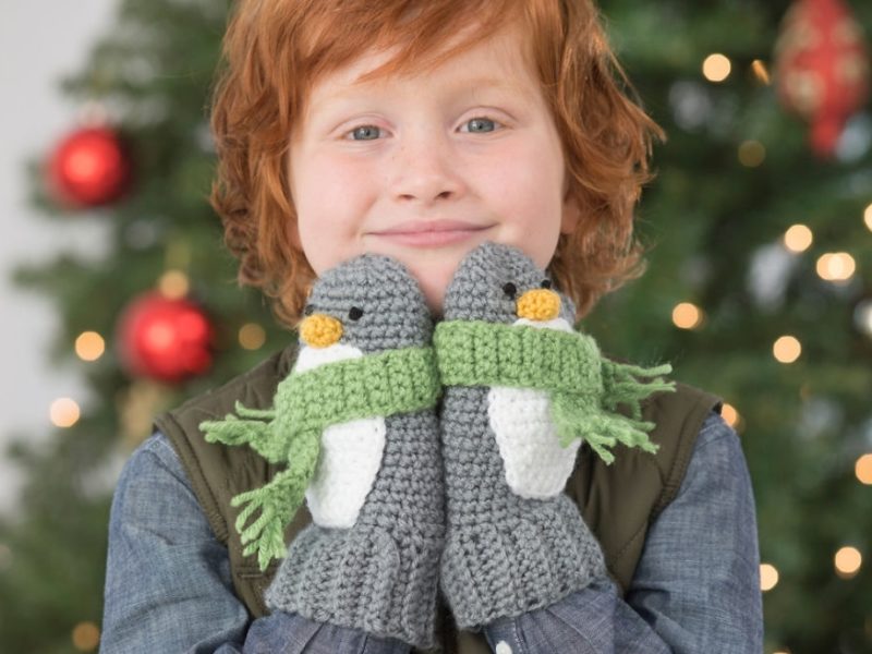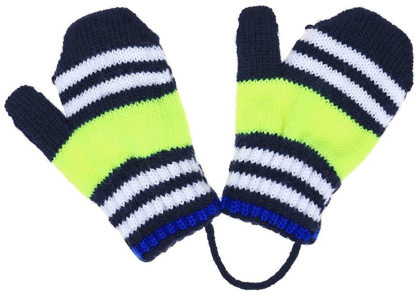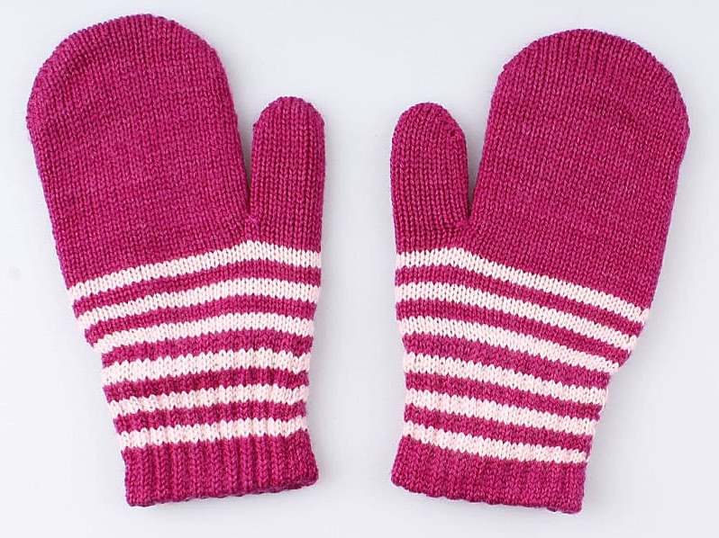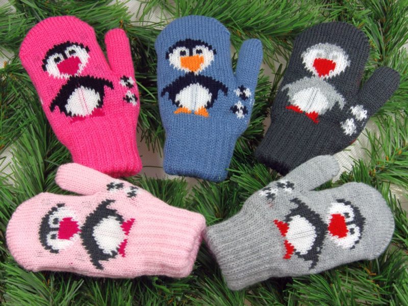Sarung tangan standard dengan satu petak ibu jari dibuat untuk kanak-kanak dari semua peringkat umur. Reka bentuk mengawal pergerakan jari semasa menangkap objek dengan saiz yang berbeza. Reben dilekatkan pada produk, yang memegangnya dalam pelukannya semasa berjalan.