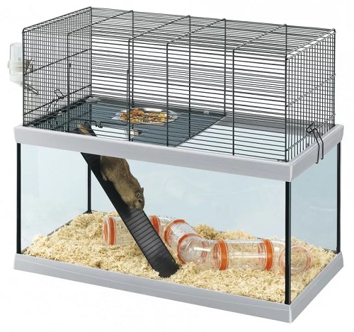 Um fabricante italiano sugere experimentar a gaiola de terrário Gabry para gerbos. É perfeito para pequenos roedores que gostam de cavar, e tudo graças ao recipiente transparente profundo. O fundo é feito de vidro transparente e a parte superior da casa é feita de metal. Devido ao vidro, a limpeza é garantida em seu quarto, porque a serragem não se espalha. Dimensões: 52 * 27 * 44 cm Se desejar, você pode escolher um modelo Gabry com tamanhos grandes. O fabricante fez 3 tamanhos para escolher. Na configuração, você encontrará um piso de prateleira de metal, uma tigela de aço, um autodrinker e uma escada de plástico.