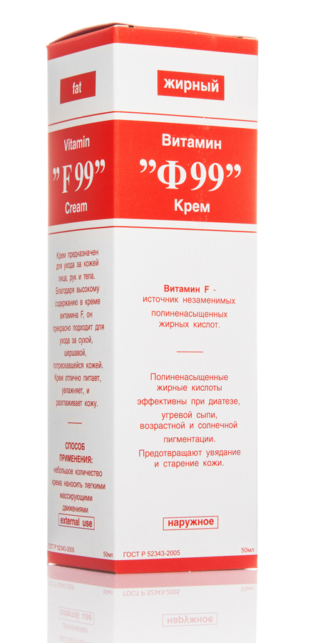 Droga russa com alto teor de vitamina F, protegendo ativamente a pele. "F99" tem uma textura gordurosa e tem propriedades regeneradoras e antioxidantes. A droga restaura a derme após queimaduras, feridas, escoriações e outras lesões de natureza diferente. Normaliza o metabolismo de carboidratos e lipídios. "F99" foi especialmente concebido para cuidar da derme seca, sensível ou danificada do rosto, mãos ou corpo. A composição do produto contém componentes como: óleo de soja, cera de abelha, óleo de espinheiro marítimo. Feridas, queimaduras, rachaduras ou úlceras cicatrizam rapidamente, a irritação diminui, a dor diminui. É um dos melhores remédios para lidar com os sintomas de rachaduras ou os efeitos das queimaduras solares. A superfície do rosto recupera a sua firmeza e elasticidade. O custo médio é de 105 rublos.