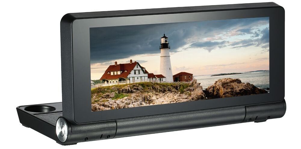 A tela colorida de 4,3 polegadas está localizada à direita. Você pode desativá-lo manualmente ou marcar a caixa nas configurações. Um display conectado à energia da luz de ré ajudará no estacionamento. A lente com lentes de vidro é uma dobradiça na qual você pode alterar o ângulo de inclinação e o horizonte.