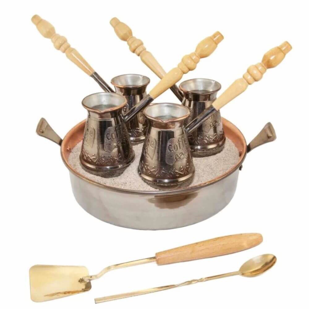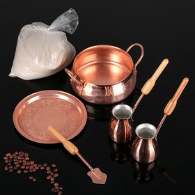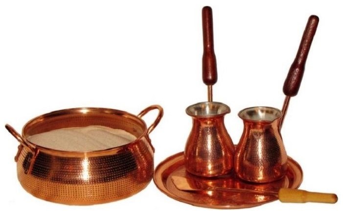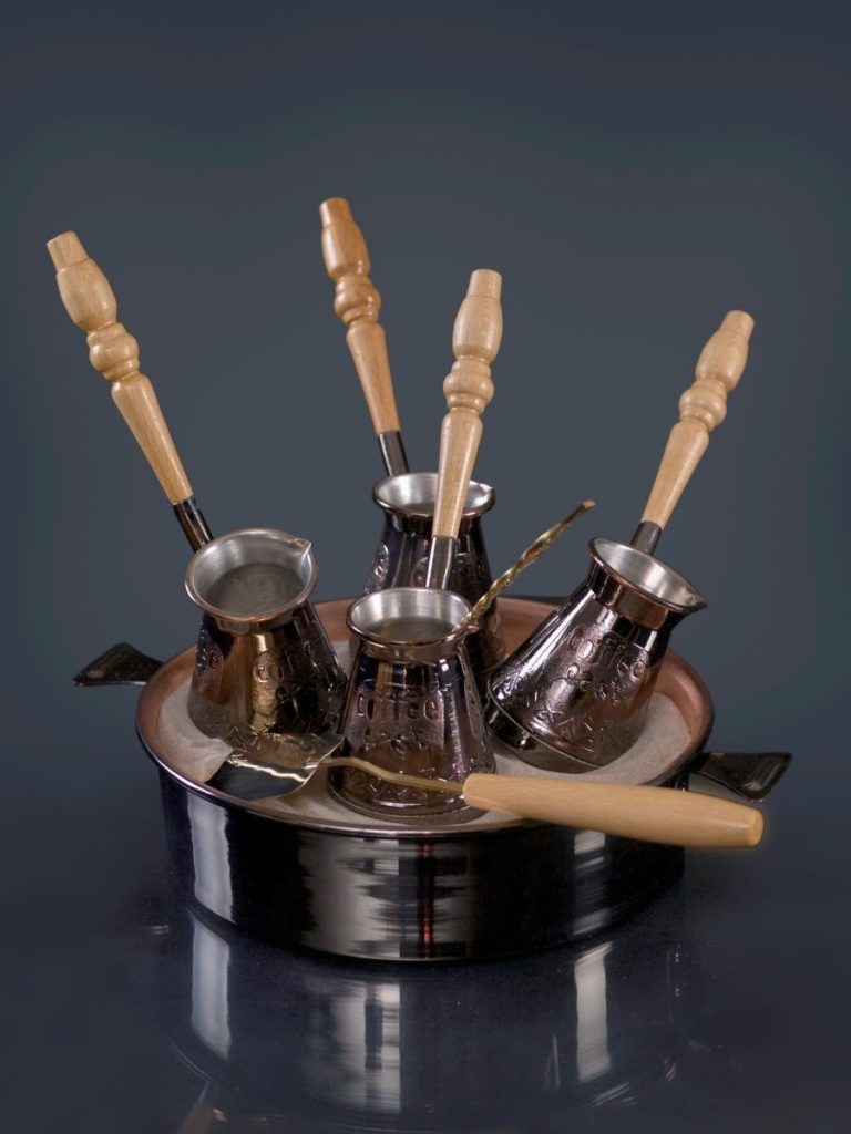 Conjunto de cobre para fazer café gourmet. Volume 0,18 l. A conveniente alça de isolamento térmico permite que você prepare uma deliciosa bebida perfumada. Conjunto completo: areia, 4 turcos, braseiro, colher, espátula. Adequado para uso em diferentes tipos de fogões, exceto indução. A cor clássica do equipamento combina com qualquer interior. Custo: 8090 rublos.