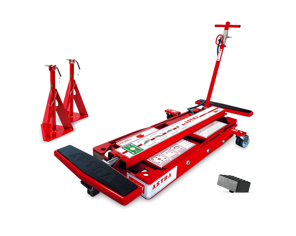 Dispositivo tipo tesoura, móvel e pneumático, projetado para elevar a parte traseira ou dianteira do carro a uma altura de até 55 cm. Amplamente utilizado em pequenas caixas. O tempo de descida e subida é de cerca de 15 segundos, o peso da estrutura é de 115 kg, os parâmetros são de 1200 x 550 x 32 mm, a capacidade máxima de carga é de 2,5 toneladas.