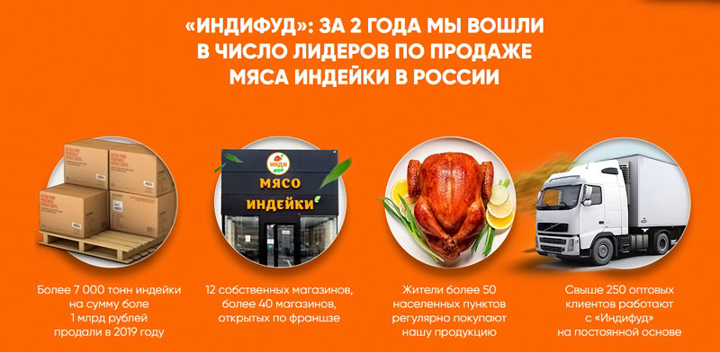 A empresa é um dos maiores fornecedores de carne de peru na Rússia. Preocupa-se com alta qualidade e preços baixos para mercadorias. O cheque médio de compra é de 350 a 400 rublos, com alto tráfego, a receita planejada por mês pode chegar a 1 milhão. Ele permite que você inicie um pequeno negócio e desenvolva toda uma rede de pontos de venda.