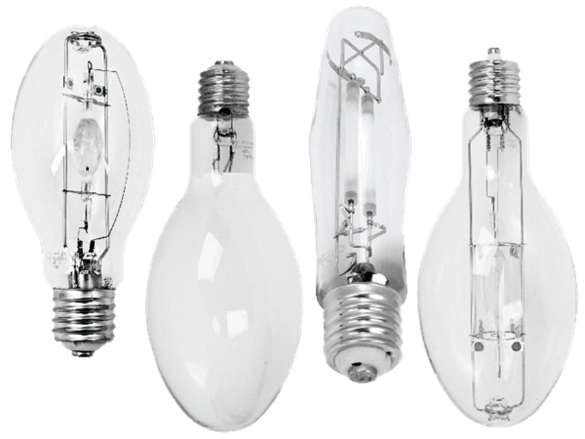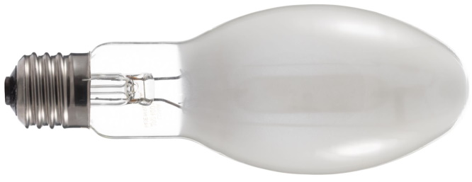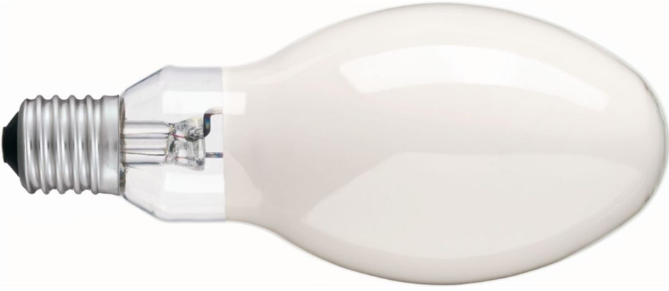Modelo altamente eficiente com base padrão para iluminação externa e interna de instalações industriais, estradas e ruas. Emite alta saída de luz com boa reprodução de cores. O frasco é preenchido com vapor de mercúrio ao qual são adicionados iodetos metálicos. Funciona através de balastros próprios para lâmpadas de sódio. Através de um difusor transparente, reduziu a radiação ultravioleta.