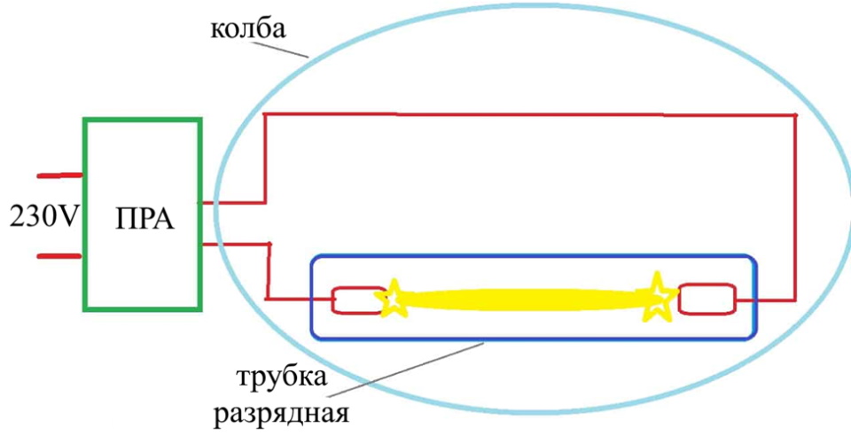 A tensão fornecida à lâmpada é convertida no reator (lastro) e é aumentada para 2-5 kV para alimentação dos eletrodos. Tais valores são suficientes para fazer com que uma faísca acenda uma descarga incandescente dentro do tubo.