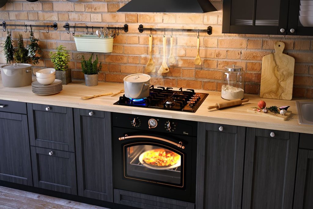 O forno é totalmente pintado de preto, incluindo a porta. Contra o fundo, interruptores prateados e uma alça se destacam lindamente. Apesar de esta combinação de cores ser considerada um clássico para fornos, este modelo parece mais original. A unidade possui controle mecânico tradicional e está equipada com ignição automática e sistema de controle de vazamento de gás, o que aumenta a segurança no uso de utensílios de cozinha.