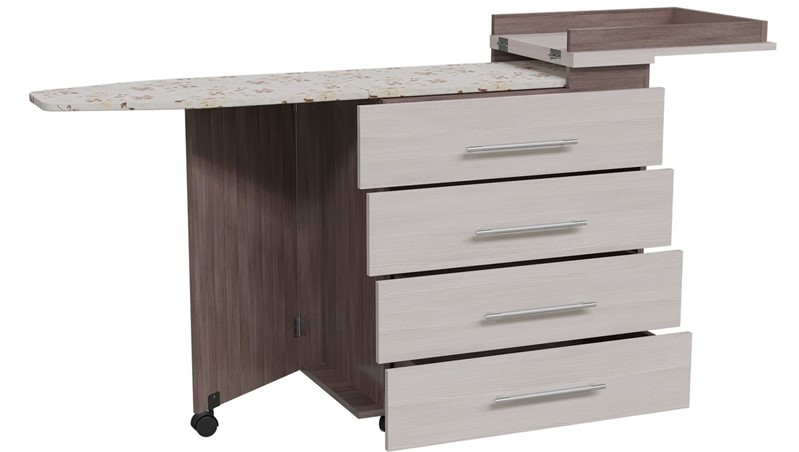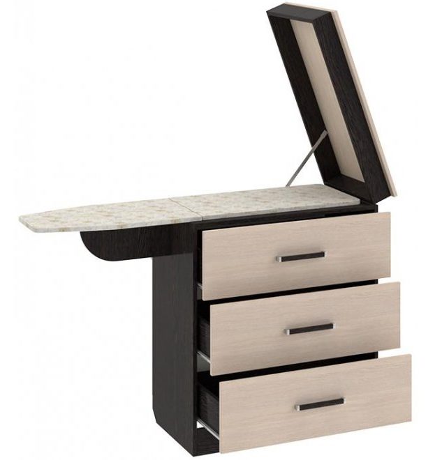 - modelos encurtados (a superfície superior da cómoda é imediatamente uma tábua de engomar. O design não é deslizante, devido ao seu pequeno tamanho é inconveniente passar roupa de grandes dimensões. A tampa pode ficar suja e deteriorar-se com o tempo).