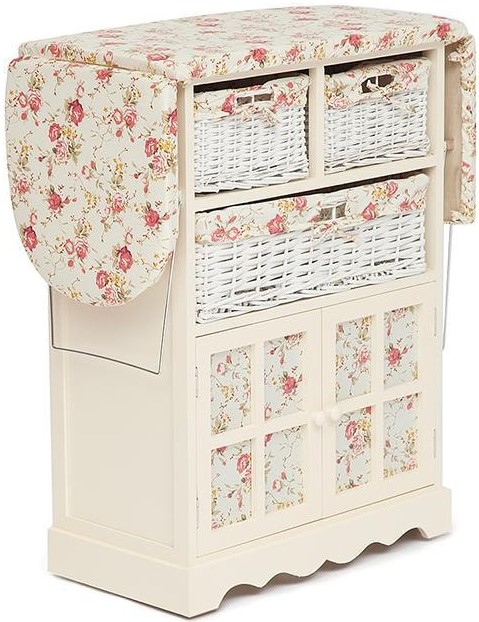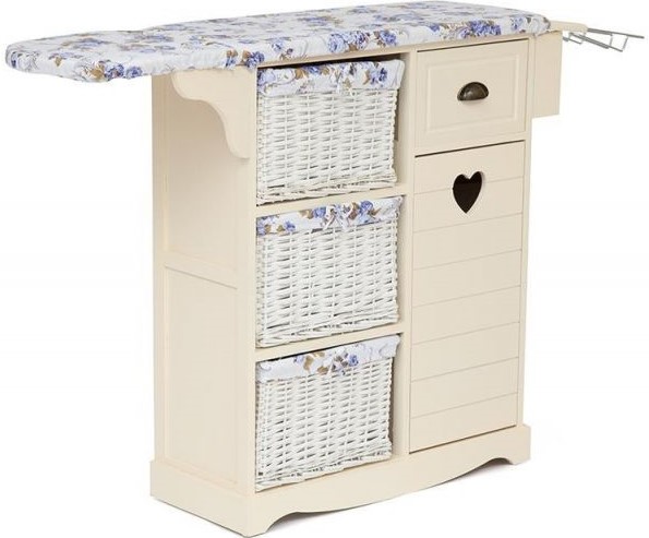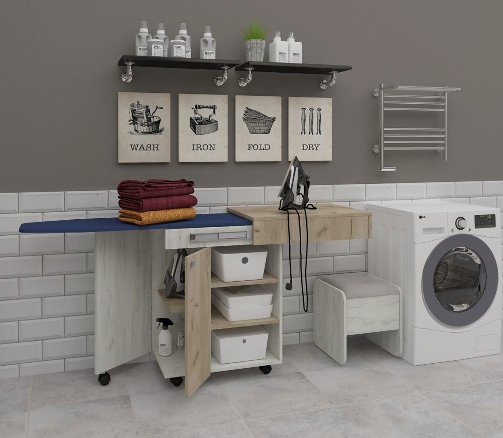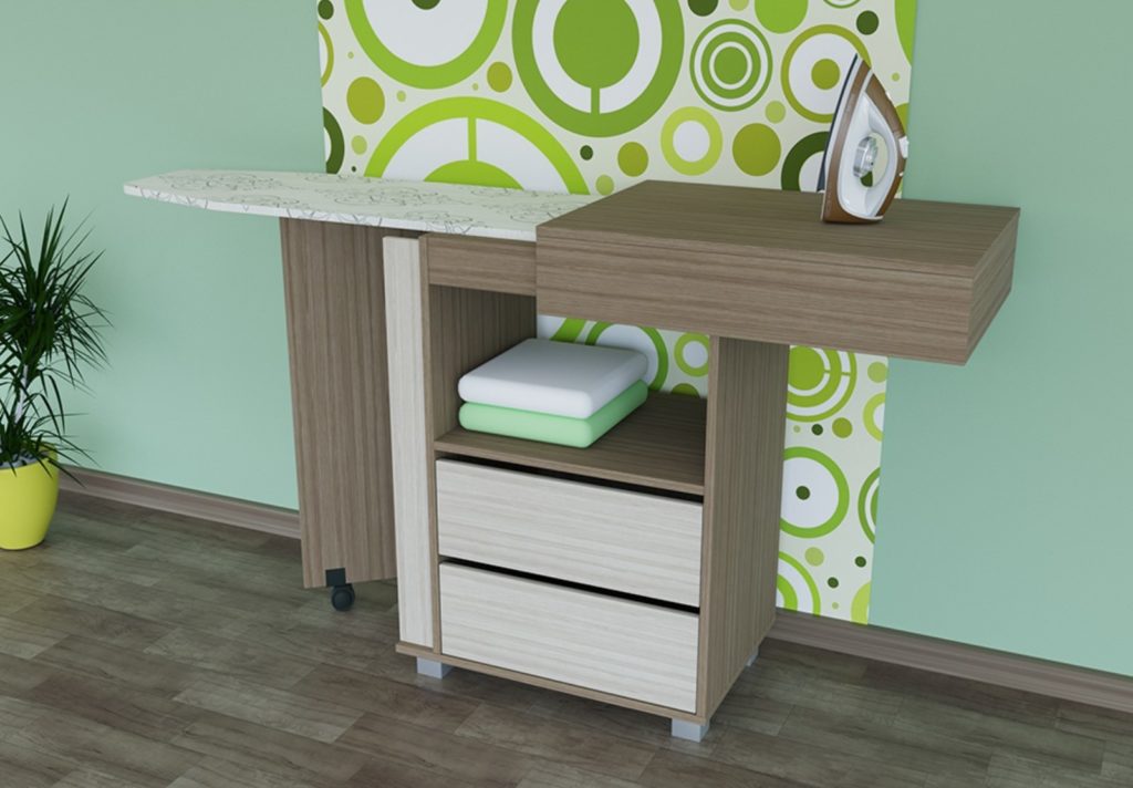 - com uma tábua de passar roupa dobrável (o design consiste em 3 partes. Duas partes laterais são dispostas nas laterais, se transformam em um local de trabalho completo. Quando abertas, as laterais repousam contra portas retráteis (bastantes), que são fixadas com segurança em uma posição);