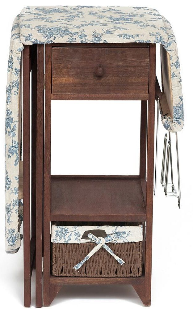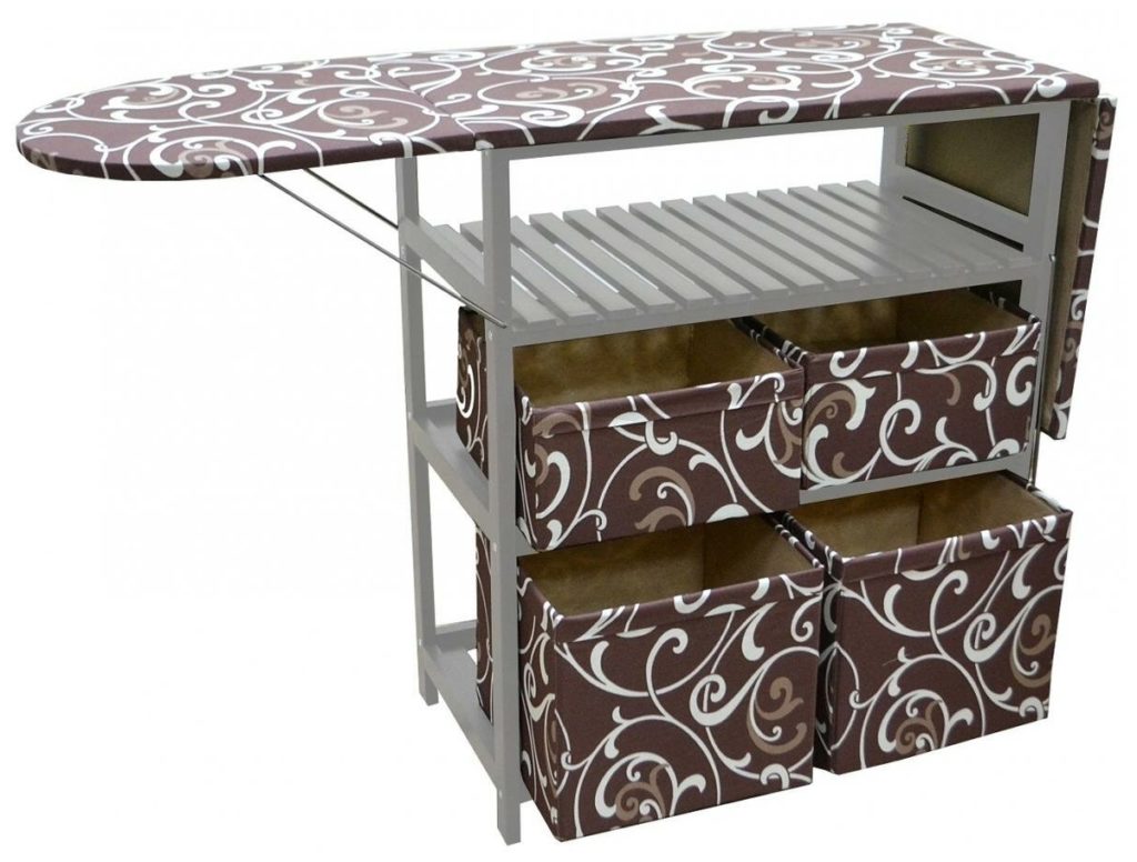 Uma cômoda com tábua de passar embutida tem 4 gavetas, 2 grandes e 2 pequenas. Padrão de tecido: monograma. Cor da superfície: marrom. Tela de trabalho: 405x1534 cm Peso: 15 kg. Quando dobrado, não ocupa muito espaço, é conveniente armazená-lo. Um ferro pode ser colocado na prateleira superior. Custo: 11224 rublos.