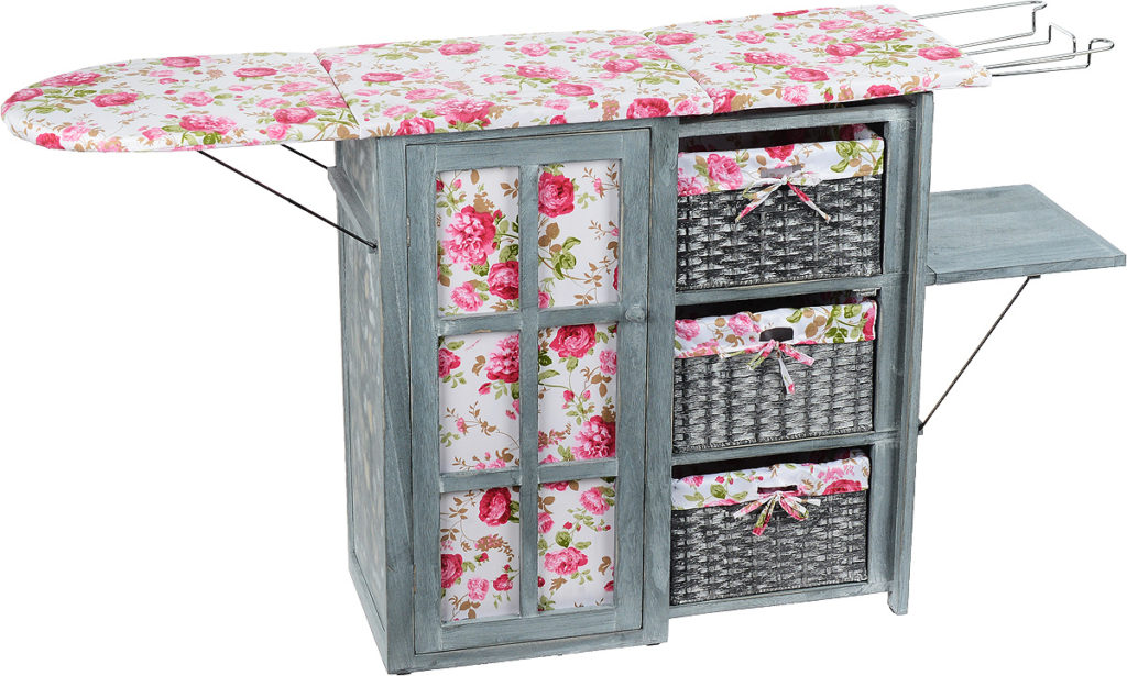 A cómoda de engomar permite poupar espaço, para além da superfície de engomar, está equipada com várias gavetas (cestos) para guardar roupa, ferro de engomar, borrifador, suporte para mangas, artigos de bordado, etc.