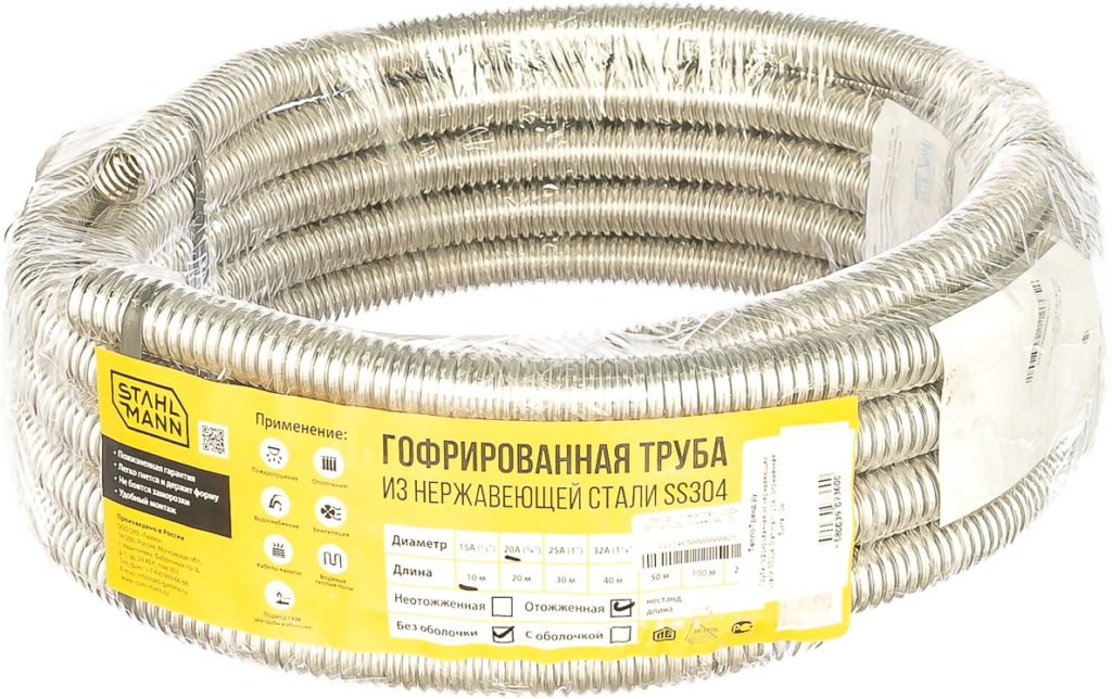 O produto é feito de aço inoxidável, possui alta resistência e uso universal. Pode ser usado para colocar tubulações e circuitos de aquecimento. Devido ao alto nível de flexibilidade do produto, não há necessidade de usar um grande número de conexões para conexão. Pode ser usado para misturas de água-glicol sem comprometer a qualidade da camada interna.