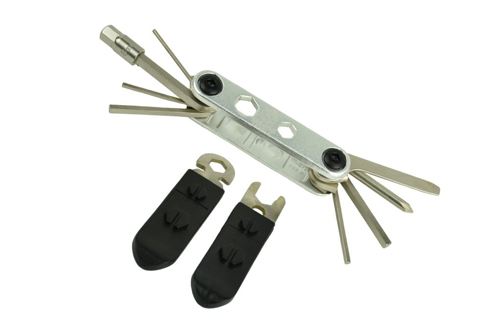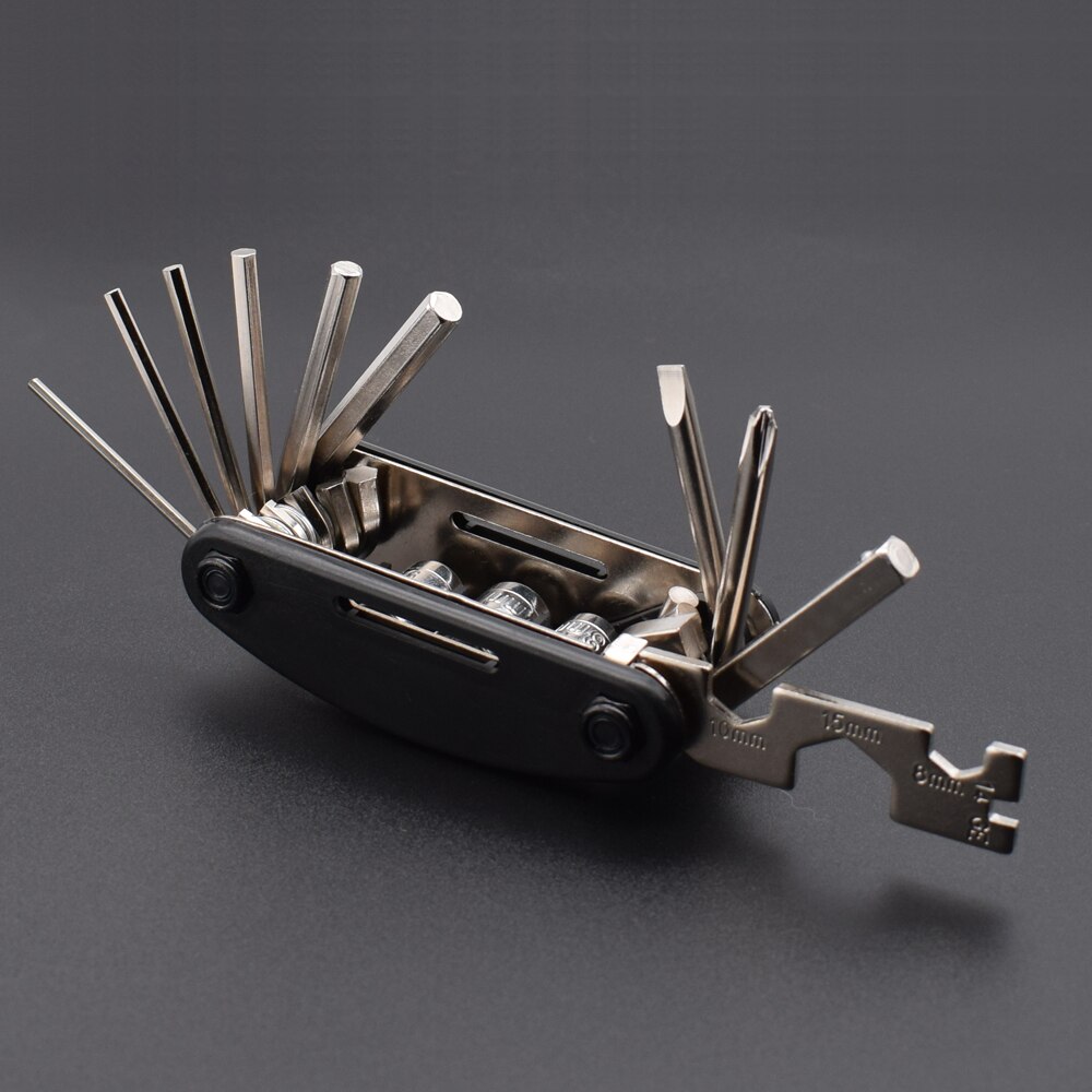 O design de bolso dobrável de um fabricante respeitável é projetado para reparar mamilos e tubos, pastilhas de freio, raios, remoção de pneus e montagem de rodas. O conjunto é feito de aço inoxidável. Além das chaves sextavadas, inclui chaves comuns e de raio, bem como chaves Phillips e de fenda. O pacote inclui 12 itens e um estojo de veludo para facilitar o armazenamento do produto.