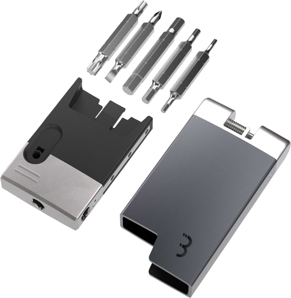 O kit inclui os seguintes itens: 10 hexágonos (tamanho 2 e 4, duas unidades cada), chave Torx (T25), raios para 14 e 15 G, espremedor de corrente, Phillips e chaves de fenda. Há também uma espátula a bordo adicional e um abridor de garrafas projetado para garrafas.
