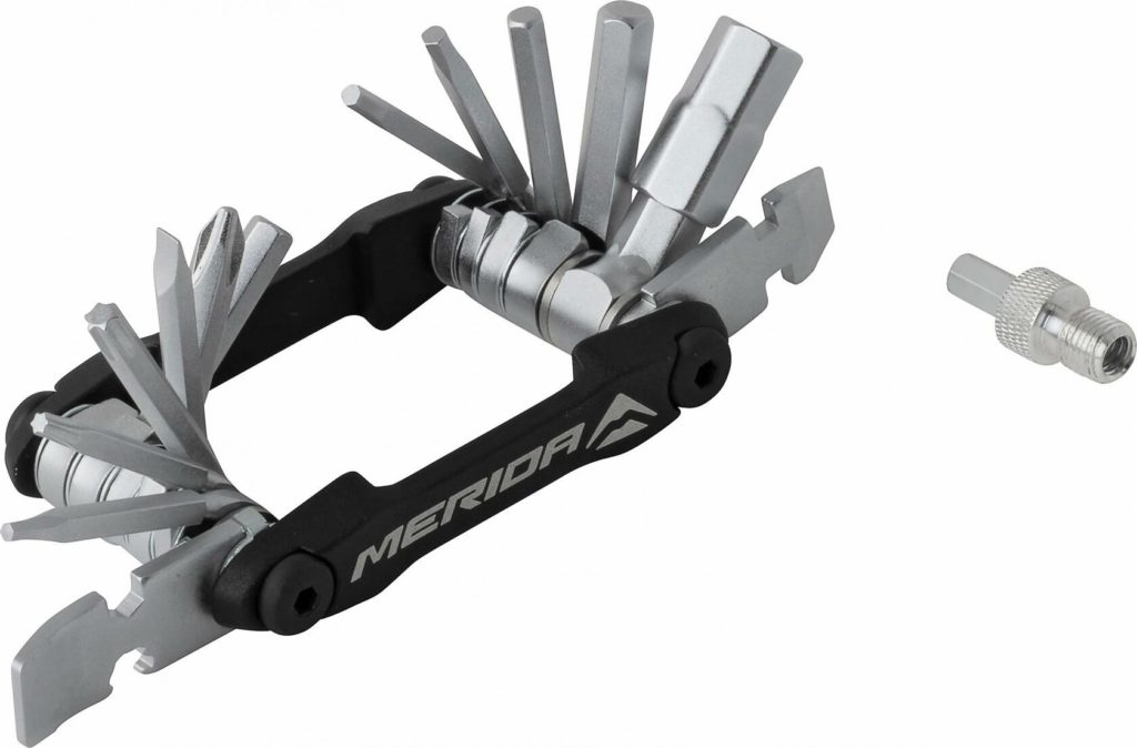 Ferramentas para reparação de bicicletas de um fabricante alemão. O produto inclui hexágonos, uma chave em forma de estrela T25, um espremedor de corrente, lâminas de montagem (duas unidades). Também estão incluídos um ajustador de raios (chaves de 4 raios), chaves de fenda Phillips e planas e um abridor de garrafas. São 17 itens no total.