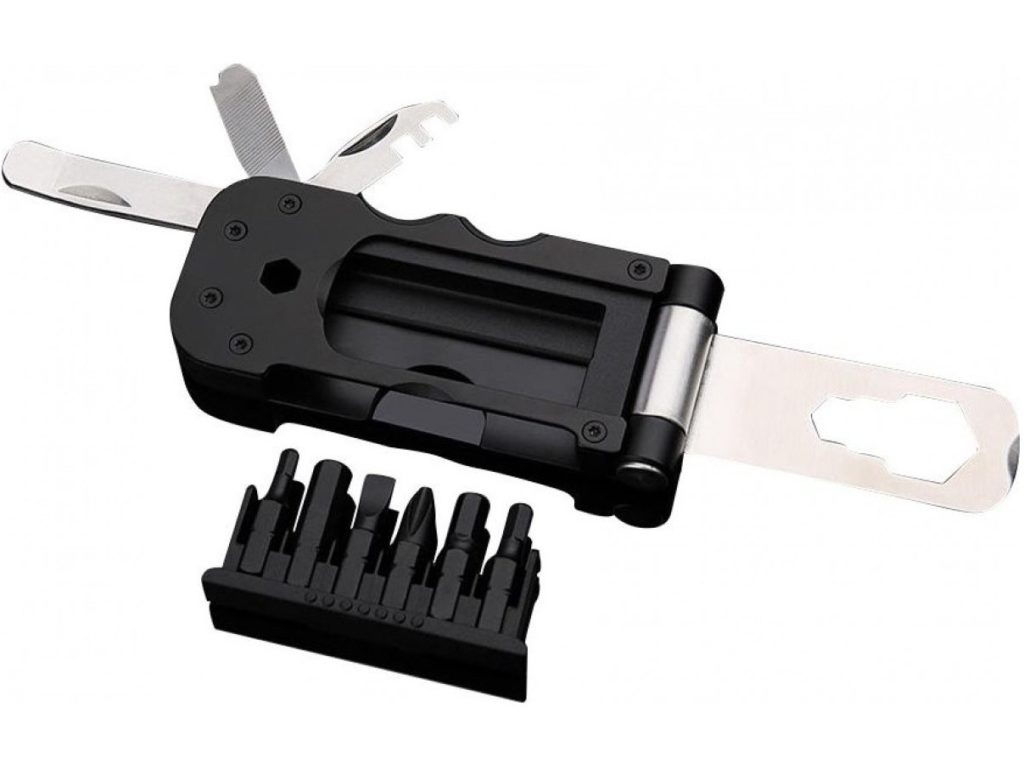A multiferramenta compacta contém 16 itens essenciais para um reparo rápido, que incluem chaves sextavadas de 2, 2,5, 3, 4, 5, 6 mm, chaves de fenda Phillips e planas, chaves de soquete de 8,9 e 10 mm, chaves de boca - 8 , 10, 15 mm, bem como uma chave de raio. O tamanho deste último é de 14 g. A embalagem inclui um botão para desaparafusar ou torcer as cabeças.