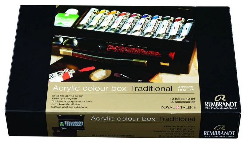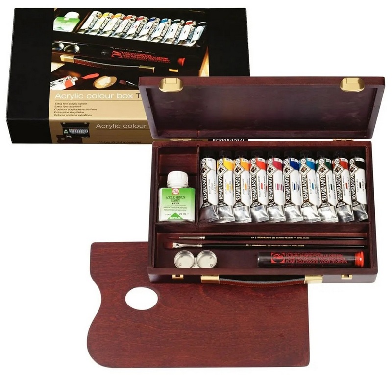 Este conjunto de oferta inclui 10 tubos de 40 ml, um meio acrílico, 2 pincéis, uma lata de óleo, uma paleta de madeira e um folheto. Todos os acessórios estão em uma elegante caixa de madeira. De acordo com suas propriedades, o conjunto será suficiente para atividades artísticas e de design de nível profissional. O custo recomendado para redes de varejo é de 30.100 rublos.