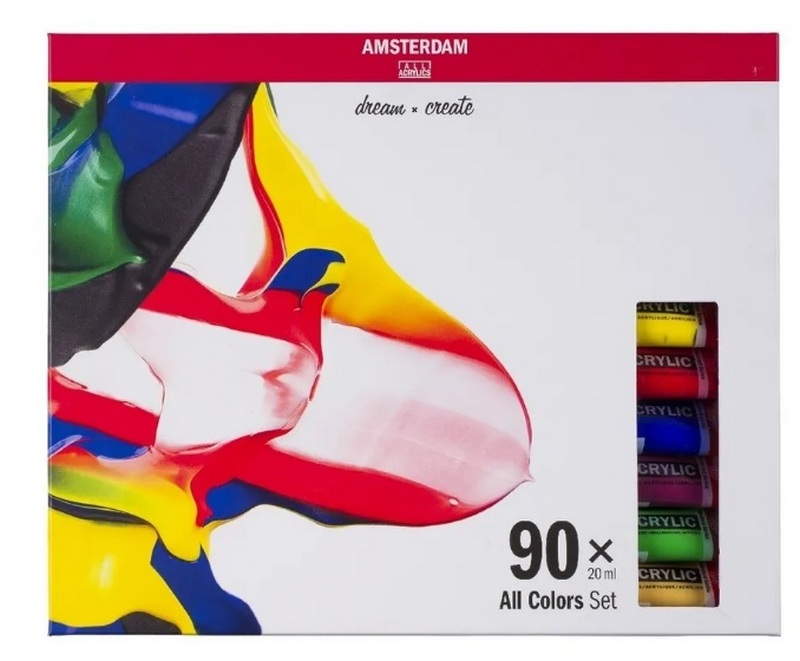 O conjunto Amsterdam é feito de pigmentos cuidadosamente selecionados e resina 100% acrílica como aglutinante. Portanto, quando seca, a tinta forma um filme durável que nem precisa de proteção adicional com verniz. Todas as cores são simplesmente misturadas entre si e, se necessário, podem ser diluídas com água.Têm uma elevada resistência à luz, são resistentes a ambientes alcalinos e não têm odor desagradável, pelo que podem ser utilizadas tanto no exterior como em casa. O material é universal em seu uso, fica plano em qualquer superfície previamente desengordurada - papel, papelão, lona, madeira, vidro, plástico, etc. O conjunto contém vários "médiuns" para dar efeitos especiais na pintura acrílica. O custo recomendado para redes de varejo é de 16.500 rublos.