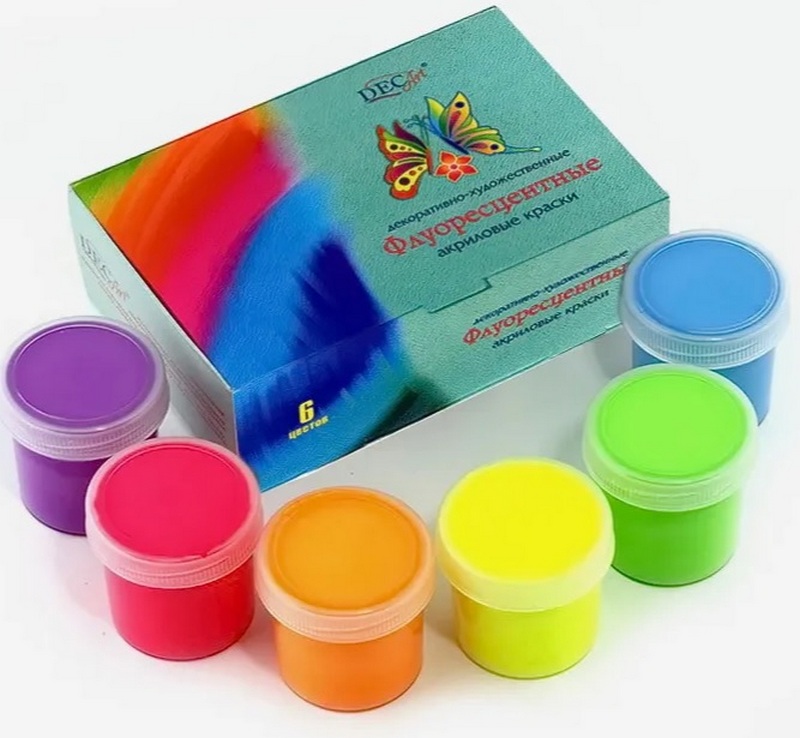 Este conjunto tem uma especificidade especial, pois inclui tintas fluorescentes, ou seja, brilhando em luz ultravioleta. Eles são adequados tanto para criatividade independente quanto para decoração e decoração, por exemplo: pintura em roupas e sapatos, acessórios de decoração.Mesmo sem iluminação UV, eles parecem muito brilhantes e, quando iluminados, começam a emitir um brilho muito perceptível. Eles podem ser misturados com base acrílica, mas irão brilhar mais fracos em uma lâmpada UV. O custo recomendado para redes de varejo é de 364 rublos.