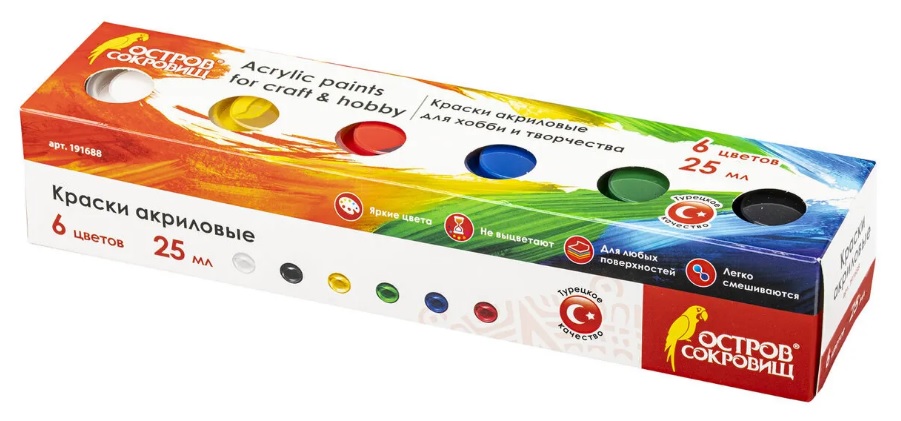 Ótimo para desenhar e decorar. Fácil e simples de aplicar em quase todas as superfícies. Proporciona secagem rápida sem alteração de cor. Eles têm um alto nível de poder de cobertura. A composição contém 6 cores brilhantes e saturadas: branco, preto, amarelo, verde, vermelho, azul. As tintas se misturam bem, não desbotam quando secas e não desbotam quando expostas aos raios ultravioleta. Quando secas, formam uma superfície fosca. Fornecido em um recipiente pop-up de 25 ml em uma caixa de papelão. O custo recomendado para redes de varejo é de 177 rublos.