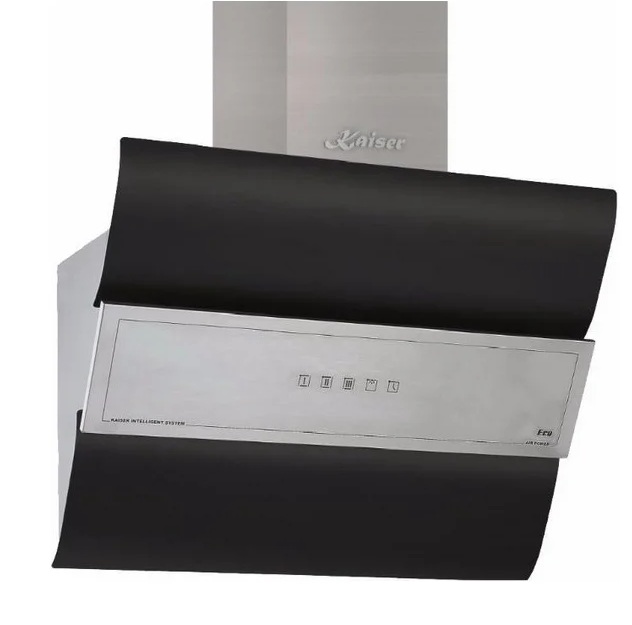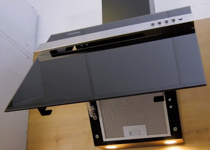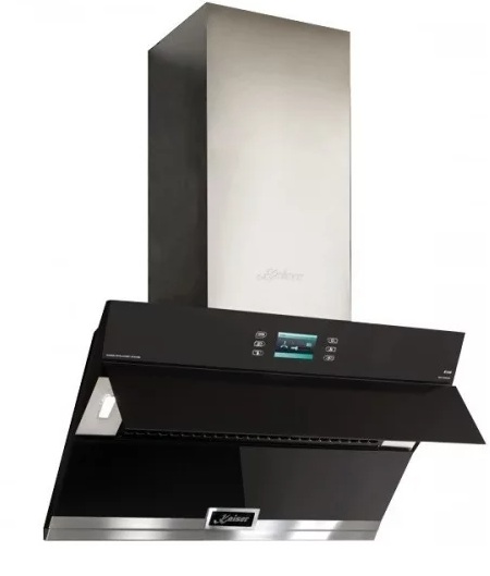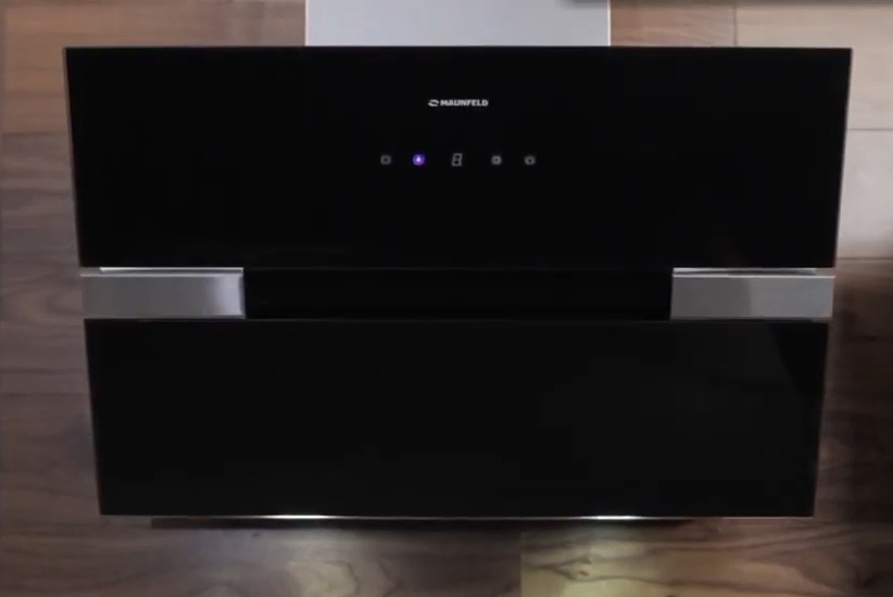 Utensílios de cozinha com saída de ventilação, controles de toque e display podem operar em dois modos. Ele permite que você defina o tempo de desligamento autônomo, selecione os modos de velocidade. O filtro de gordura é de fácil limpeza, possui indicador de contaminação que avisa o momento necessário para sua limpeza. O painel frontal é feito de vidro colorido durável e resistente ao calor, a estrutura é feita de metal resistente à corrosão, o filtro é feito de alumínio. Abaixo estão duas lâmpadas redondas com luz de fundo LED, que é ajustável de acordo com o grau de brilho da fonte de luz.