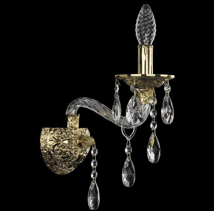 Este modelo irá decorar qualquer ambiente. Perfeito para o estilo clássico. A arandela é feita de metal e decorada com pingentes de cristal. Devido ao qual o feixe de luz é adicionalmente espalhado pela sala. A arandela usa lâmpadas incandescentes.