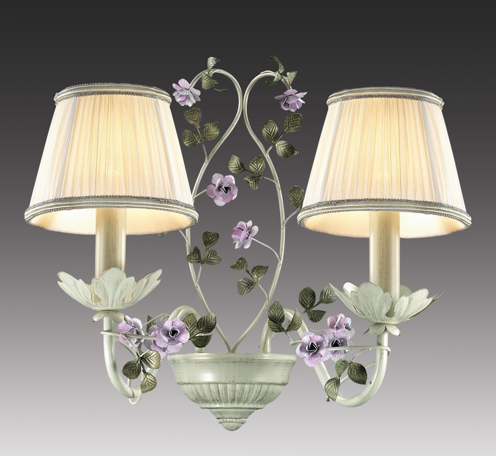O modelo é ideal para naturezas românticas.Mais frequentemente usado no estilo provençal. Dois pequenos abajures decorados com estampa floral tornam o quarto aconchegante. Duas lâmpadas incandescentes são usadas para iluminação, portanto, para salas grandes, é recomendável usar várias dessas arandelas.