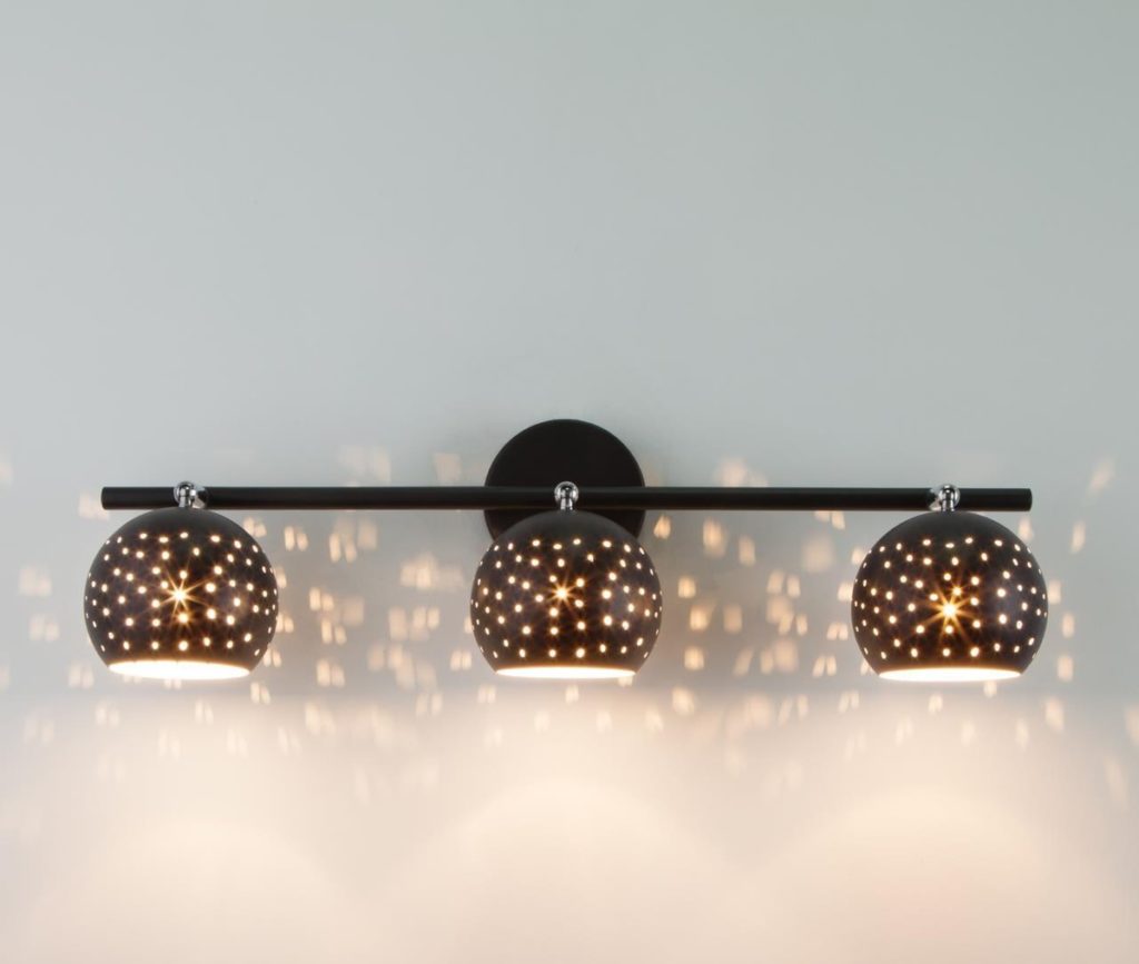 O design tem a forma de três tons que são fixados na parede. Os plafonds têm pequenos orifícios, para que a luz se espalhe suavemente pela sala. Ao comprar uma arandela, as lâmpadas estão incluídas no pacote. O abajur e a placa de montagem são feitos de metal. O candeeiro de parede brilha intensamente, pelo que pode ser utilizado como iluminação adicional por cima da cama ou da área de trabalho.