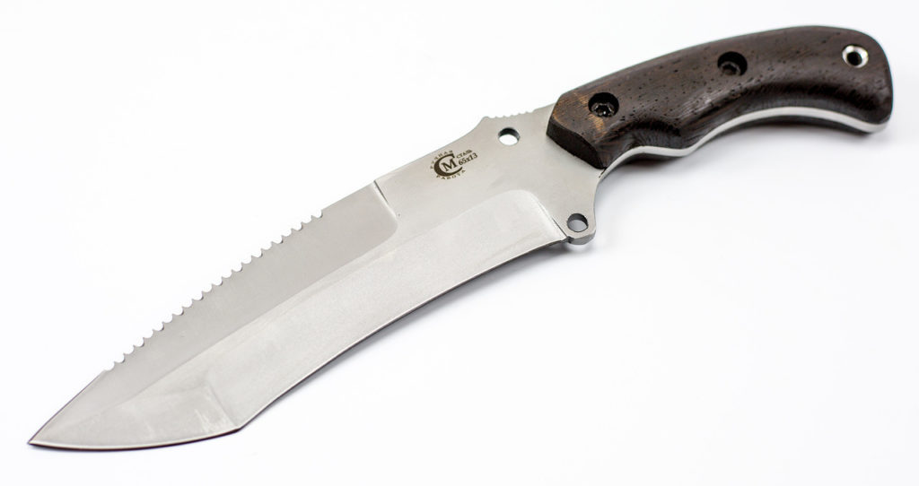 A arma é adequada tanto para acabar com a fera quanto para cortar e esfolar a presa. O cabo é feito de madeira wengué: não escorrega e fica confortavelmente na palma da sua mão.