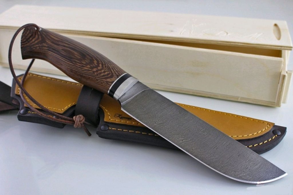 O modelo é feito de 400 camadas de aço Damasco - duro e durável. Esta ferramenta está em total conformidade com os requisitos do padrão estadual e pertence à classe de facas de trinchar e esfolar. Portanto, não é necessária uma licença de compra.