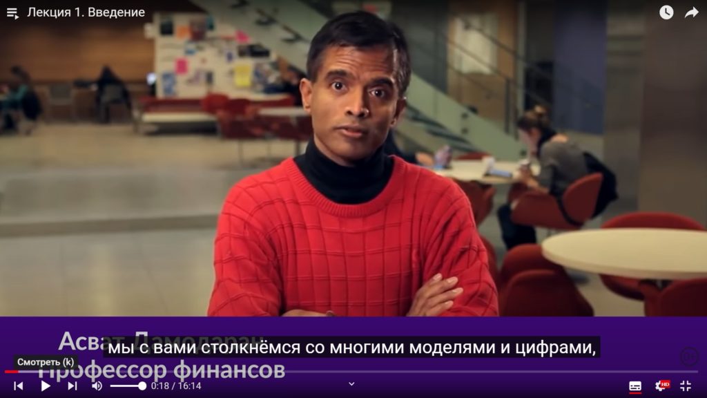 Palestras gravadas pelo professor Aswat Damodaran e postadas na hospedagem de vídeo mais popular do YouTube serão de interesse tanto para iniciantes quanto para profissionais. Durante 25 palestras, o palestrante revelará os termos e conceitos básicos, explicará de forma acessível os fundamentos do trabalho na bolsa de valores, analisará exemplos específicos de operações e fará muitas recomendações.