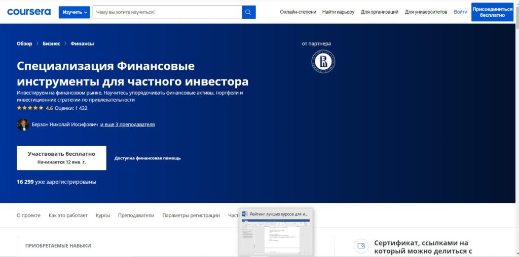 Este programa foi criado pelos professores mais experientes da Escola Superior de Economia da Universidade Nacional de Pesquisa. O conhecimento sobre as peculiaridades de trabalhar no mercado de ações e os princípios de criação de uma carteira eficaz é apresentado de forma acessível. Existe a possibilidade de educação paga e gratuita. O programa é projetado para 7 meses.