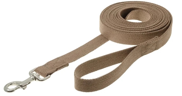 Trela de lona para animais de estimação, uma cor. Em uma extremidade há um laço para segurar, na outra há um fecho de metal para um colar. O modelo pode ser usado para atividades cotidianas, bem como exercícios.