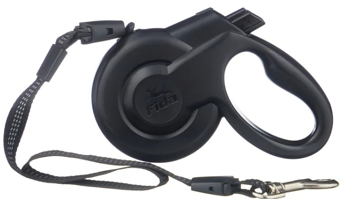 A trela do controlador preto no cabo tem uma forma ergonômica do suporte, um botão de ajuste de comprimento. Adere-se à gola com um gancho de metal (fixado com segurança). O corpo do carretel é feito de plástico (várias opções de cores estão disponíveis).