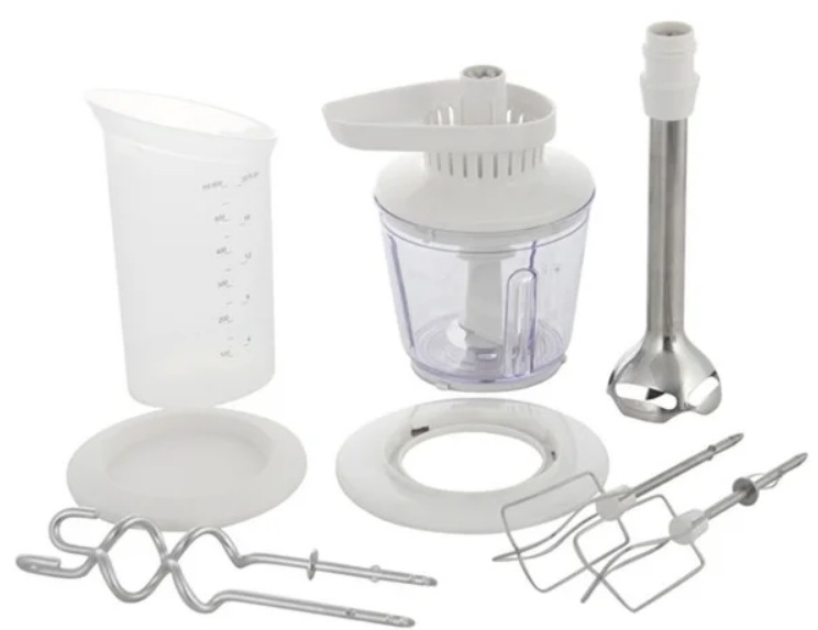 O número mínimo de bicos é um conjunto de 4 elementos - vários batedores e dois ganchos de massa. É preferível ter um copo com riscos para medições e um recipiente para mistura. O equipamento estendido inclui um bico para picar alimentos, mas os profissionais acreditam que para isso toda cozinha deve ter um liquidificador.