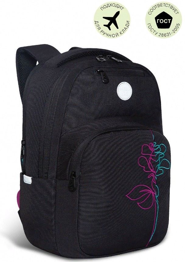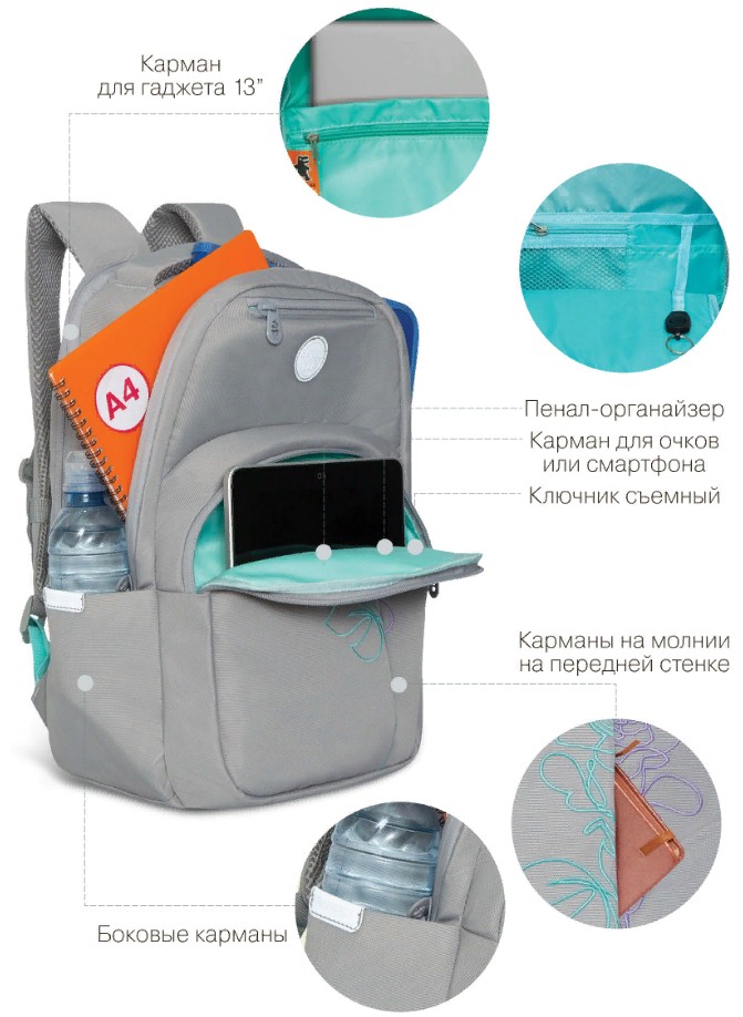 A capacidade da mochila é de 21 litros, por isso cabe um grande número de coisas. São 3 compartimentos e 5 bolsos para eles: para laptops com diagonal de tela de até 13 polegadas, papéis A4, papelaria e outros acessórios. Na parte externa, nas laterais, há 2 bolsos fechados para guarda-chuva e garrafa de água.