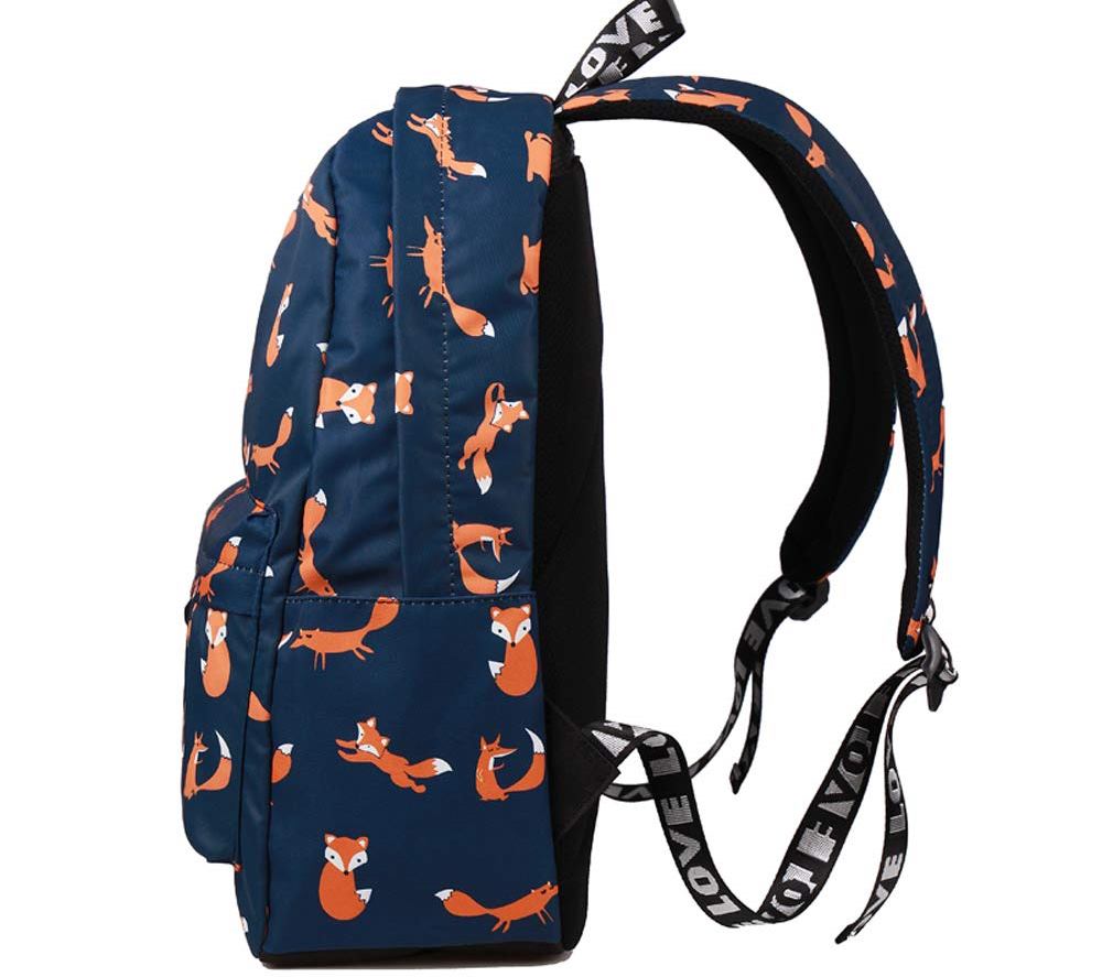 Este modelo é projetado para condições urbanas. É pequeno em tamanho e decorado com a imagem de raposas. A mochila é feita de poliéster, por isso é fácil de limpar.O produto possui um compartimento grande, que possui vários bolsos adicionais. Incluindo um bolso para documentos.