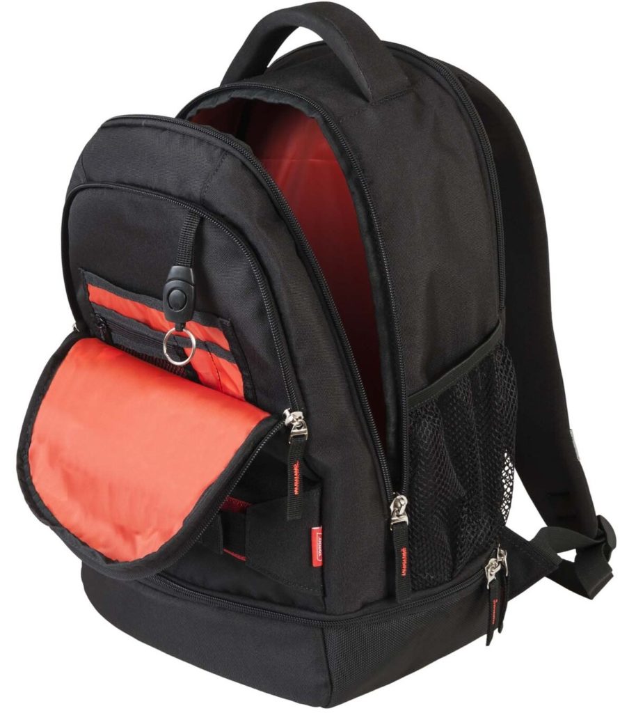 A mochila tem muitos compartimentos e bolsos pequenos. De referir ainda que o produto possui uma ranhura para carregamento e auscultadores.