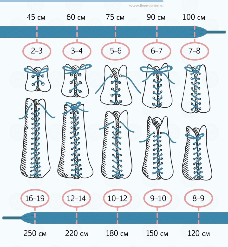 Com a ajuda de cadarços, você pode complementar a imagem e torná-la elegante e original, mas isso está sujeito ao acessório certo. Antes de comprar, primeiro você precisa decidir sobre o comprimento dos suportes. A maneira mais fácil de fazer isso é medindo os antigos, mas se isso não for possível, você poderá descobrir o comprimento pelo número de furos. A foto abaixo ajudará nisso, que mostra claramente o número de furos e o comprimento necessário para eles.