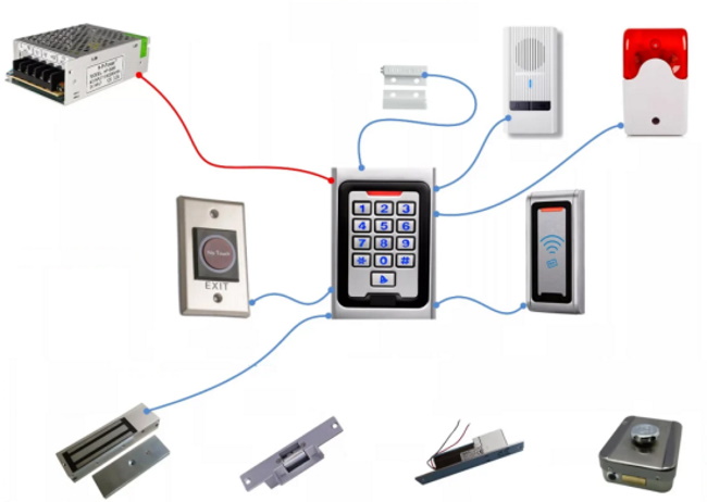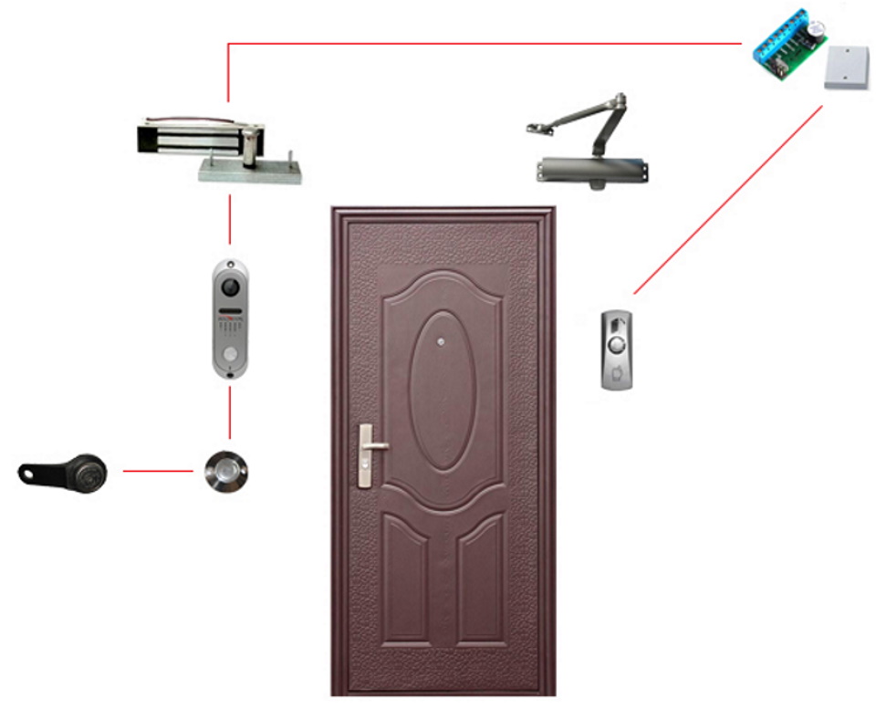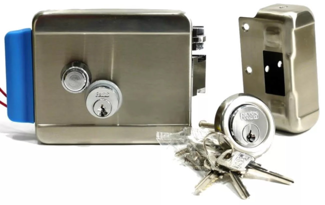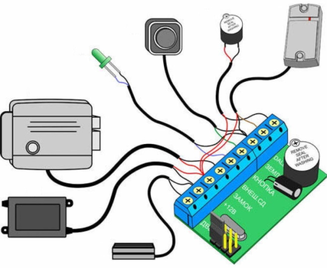 Os componentes são conectados por um cabo, cujo número de núcleos é determinado pelo diagrama de instalação. Normalmente é usado um cabo de sinal de seis ou oito núcleos. Ao instalar uma fechadura em uma porta, uma transição de porta é usada para proteção mecânica. O controlador e a fonte de alimentação são montados internamente na parede em locais de baixo tráfego em um caso especial. Os terminais são fixados de acordo com as instruções de cores.