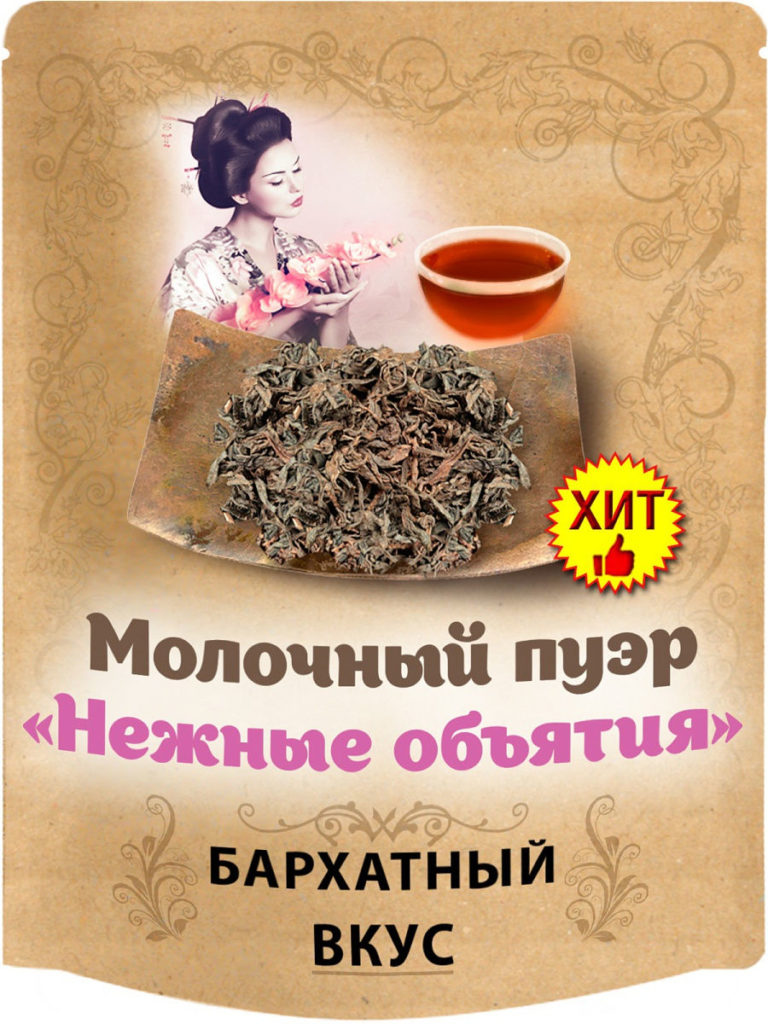 O chá com este nome é um representante de uma bebida láctea. Isso se deve à adição de aromatizante natural na forma de soro de leite. Sua rica cor marrom escura e sabor profundo com um distinto sabor amadeirado são combinados com leves notas de aroma de leite. Por direito, o chá "Abraços suaves" é considerado uma panacéia para muitas doenças. Recomenda-se consumir após as refeições, como bebida de sobremesa, pois promove uma melhor digestão. Os conhecedores iniciantes dos produtos Shu Puer apreciarão esse presente.