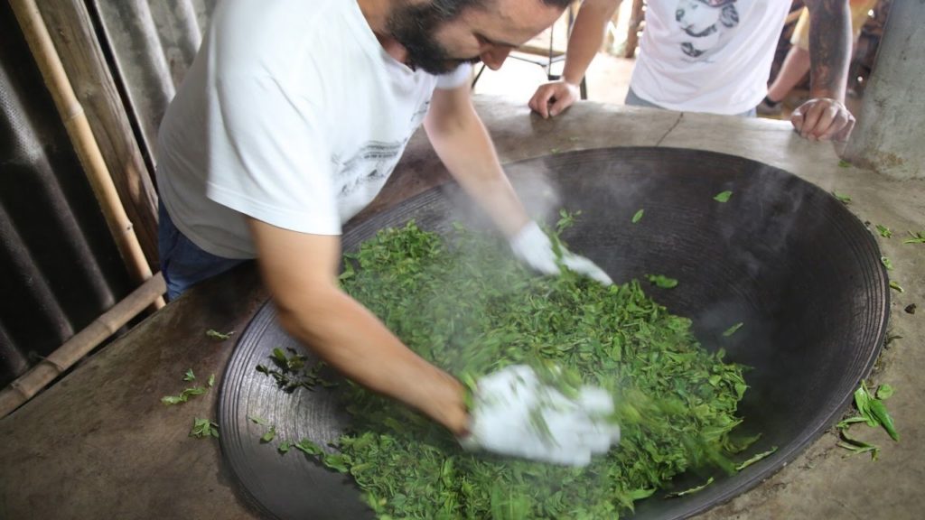 O processo de colheita do chá "cru" é semelhante ao "pronto", mas a diferença é que as folhas são imediatamente embaladas em pequenas porções em sacos de tecido, prensadas, submetidas à secagem forçada em fornos especializados. Essa etapa é produzida em poucos dias, o que confere à variedade um preço mais acessível. Para os consumidores, esse chá é fornecido na forma de comprimidos ou cubos prensados.