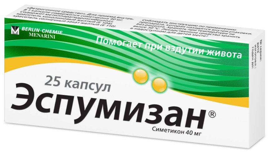 Antiespumante. A substância ativa - simeticona, é quimicamente inerte, não é absorvida pelo sangue, não remove minerais, vitaminas com uso prolongado. É prescrito para flatulência, envenenamento com detergentes, antes do exame de órgãos internos (raio-X, ultra-som). Forma de liberação - cápsulas, emulsão, sachês, gotas (para crianças). Produtor - Berlin-Chemie / Menarini, Alemanha. Custo - a partir de 295 rublos. (25 cápsulas) até 561 rublos. (gotas 50ml).