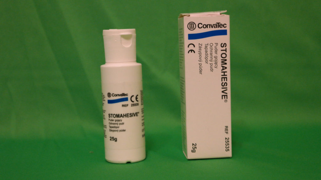 Uma substância universal que pode ser usada para o cuidado do estoma e da pele ao redor. Protege, protege contra vermelhidão e ação irritante das massas e líquidos que saem. A ferramenta provou-se muito bem como uma substância cicatrizante de feridas. É aplicado facilmente, não requer habilidades adicionais. Só é necessário distribuir cuidadosamente o pó sobre a superfície. O componente não causa reações alérgicas. Não é tão caro, cerca de 650 rublos.