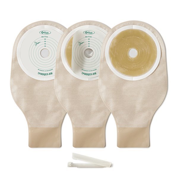 Uma bolsa de alta qualidade feita de uma base densa, projetada para cuidar do estoma do intestino grosso e delgado. É feito de polietileno, é hermético e tem uma forte fixação ao corpo. Há um forro devido ao qual não há contato direto da pele com o material principal do produto. A tira é colada com segurança e hipoalergênica.