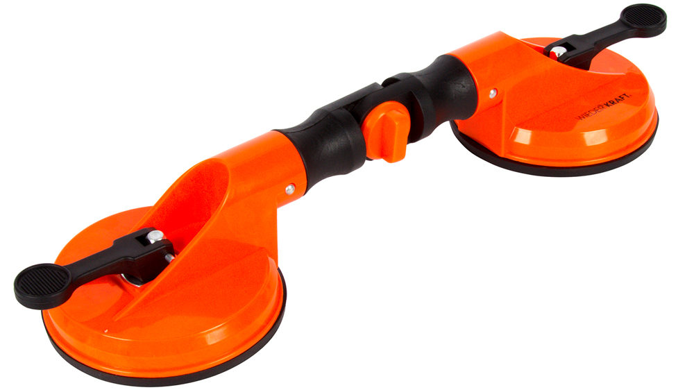 O dispositivo de um fabricante conhecido é notável pela capacidade de ajustar o ângulo das ventosas. À disposição do usuário está um ajuste de 90-270°. Essa tecnologia amplia significativamente o leque de possibilidades para o trabalhador, principalmente na instalação de vidro. Além disso, a alça também está equipada com um mecanismo de inclinação, que permite definir a posição desejada da ferramenta em pouco tempo. A arquitetura do dispositivo permite trabalhar com superfícies de formas não padronizadas. O corpo é feito de plástico reforçado, o que garante uma longa vida útil. O diâmetro de 115 mm dos elementos de trabalho proporciona uma ampla aderência e fixação firme.
