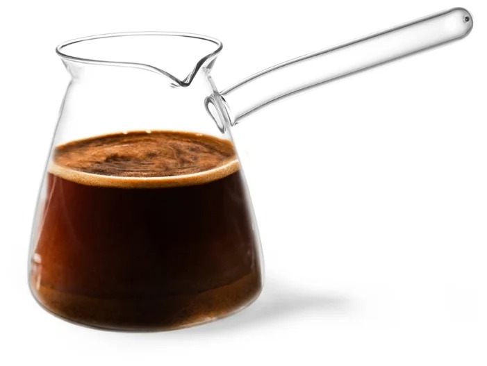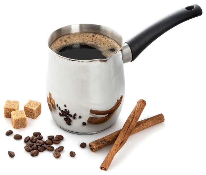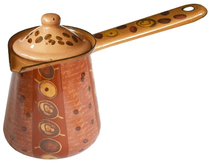 Um recipiente para fazer café - ou cezve, tem a forma de um recipiente, que consiste em: