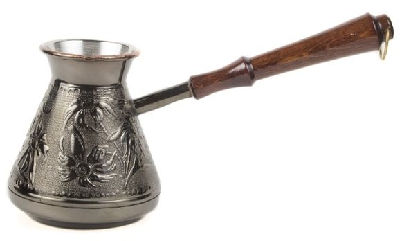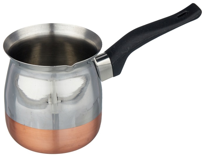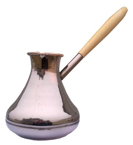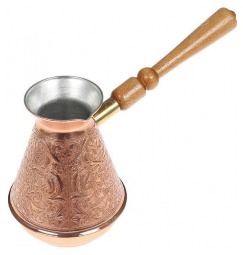 O recipiente de aço inoxidável é capaz de acomodar vários copos de bebida aromatizada. Distingue-se por uma campânula mais estreita, que não permite que a espuma espirre na placa. Possui cabo de madeira que evita queimaduras nas mãos. A base do cezve é decorada com um motivo caprichoso, graças ao qual se encaixará com sucesso no design de qualquer cozinha.