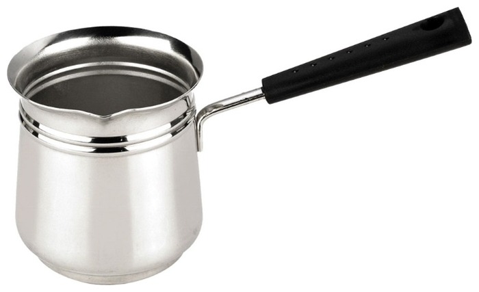 A louça para criação de café tem a base de aço inoxidável. O recipiente está equipado com um suporte de baquelite com propriedades de isolamento térmico. A forma do turco se encaixa perfeitamente em qualquer interior.
