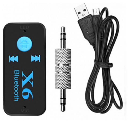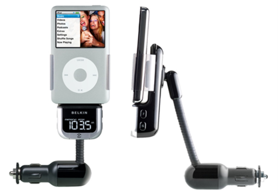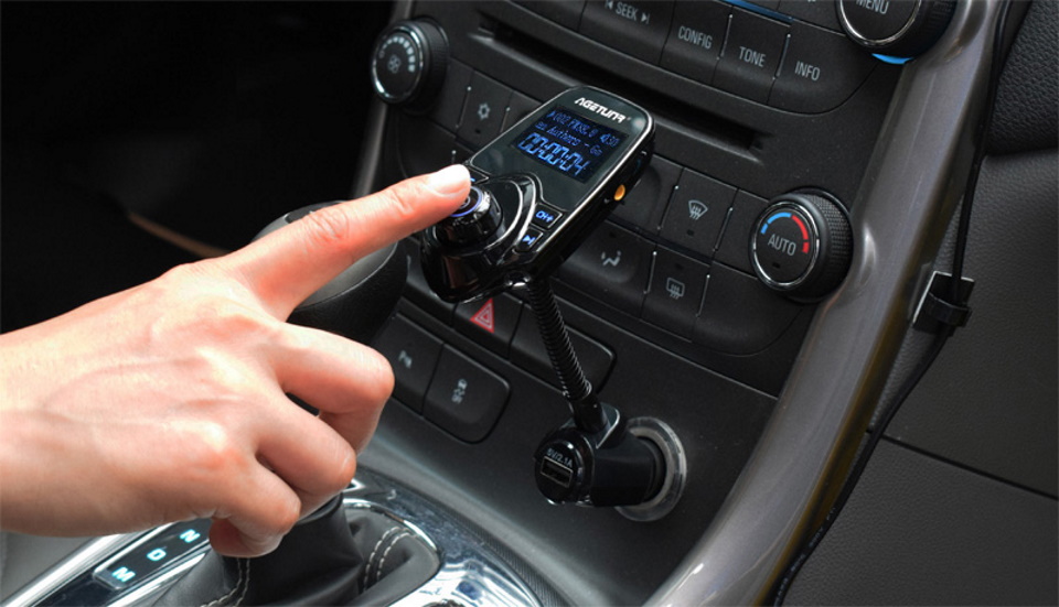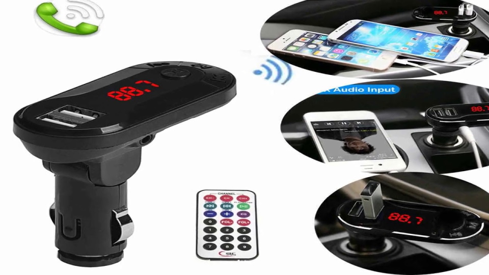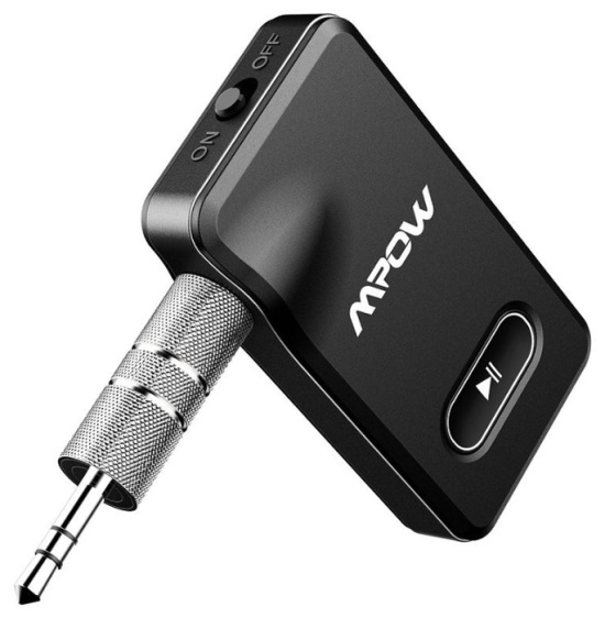 Um modelo em miniatura para conectar um dispositivo móvel a um rádio de carro via Bluetooth ou via entrada AUX. A presença de um microfone embutido oferece a capacidade de usar o dispositivo para chamadas com viva-voz no carro.